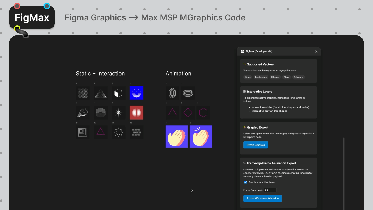 With the Figma plugin FigMax, you can easily convert your vector graphics in Figma into MGraphics code to use with v8ui and jsui in Max MSP!